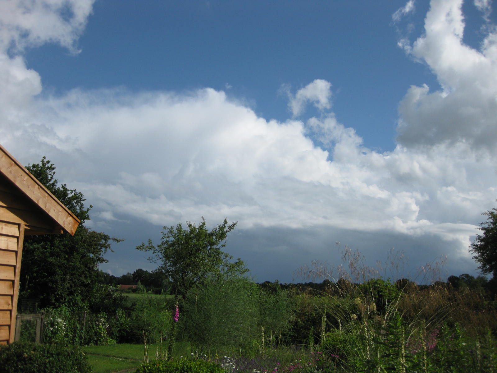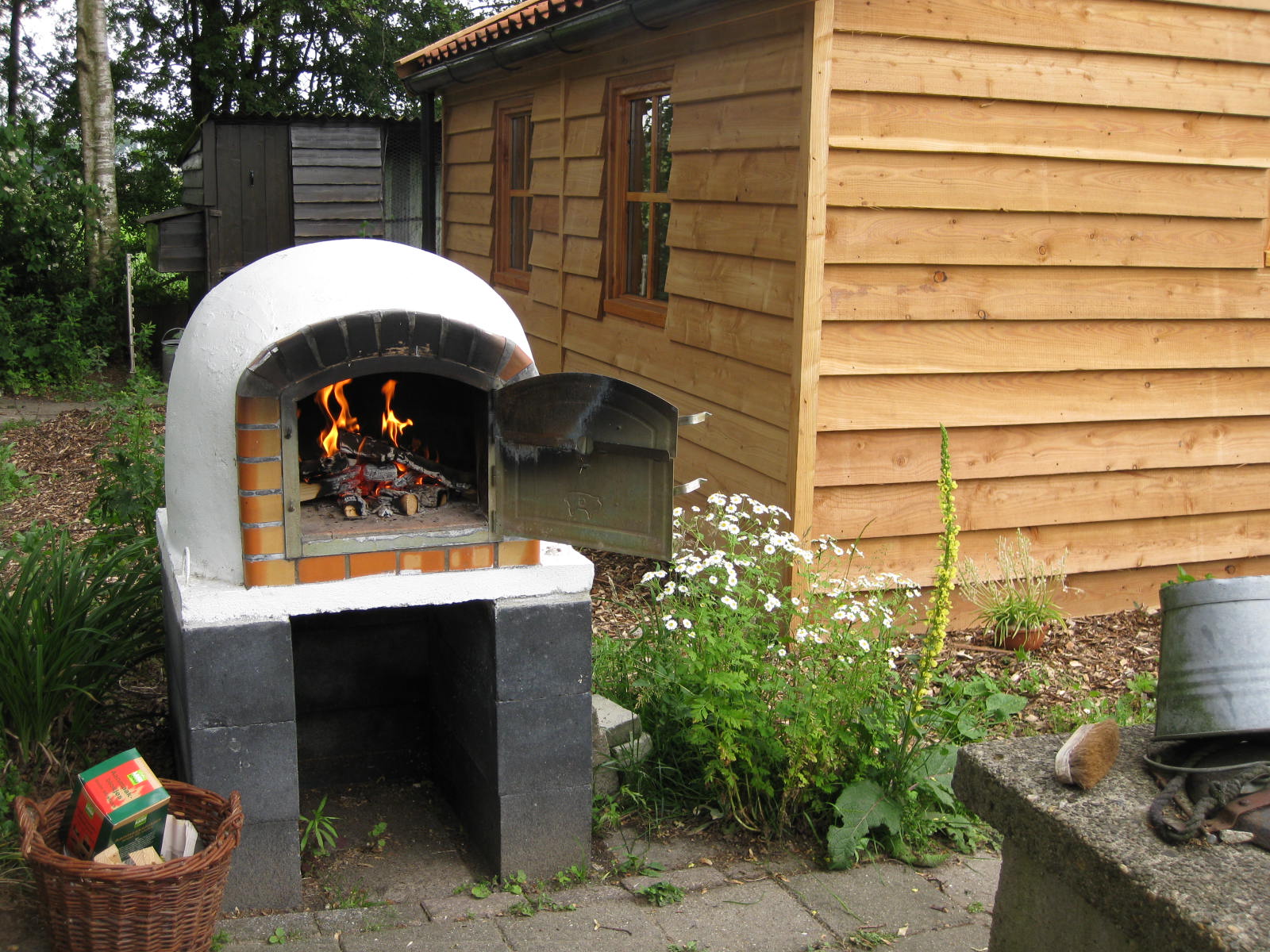 Nog even en dan is het gastenverblijf, Het Kleine Huis, binnen geheel afgemaakt en geïsoleerd. Dan volgt verven en inrichten. Midzomernacht is het, qua slapen, ingewijd. Heerlijk om ’s morgens door de deuren het gras te zien, de boeddha, de bomen, de lucht, de wolken.